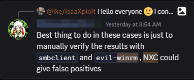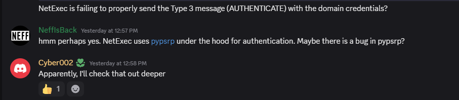 I checked the OffSec Discord and found similar complaints. Students were seeing false negatives with NetExec and were being advised to “never trust just one tool.” While valid advice, I didn’t want to just work around the problem. I wanted to know why two tools using the same protocol yielded different results.