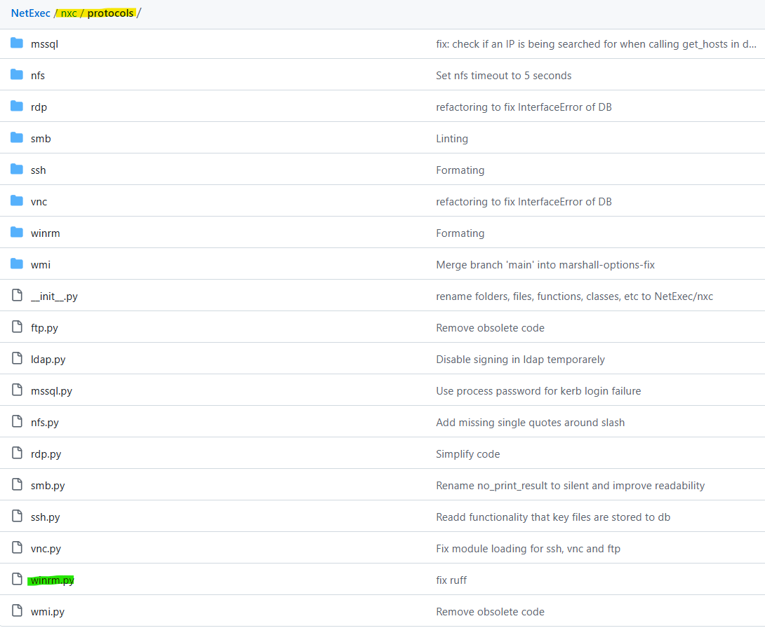 but we find the winrm implementation in a winrm.py file which is called when we use nxc winrm, the file is inside the protocols directory.