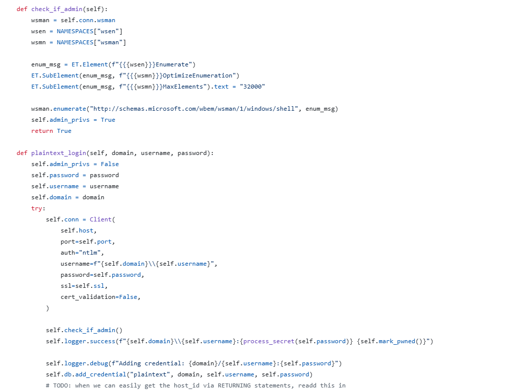 The full authentication check happens here, we can see conn.wsman and self.conn= Client, these are some external functions.