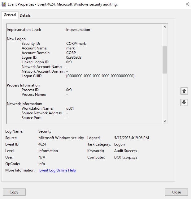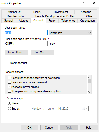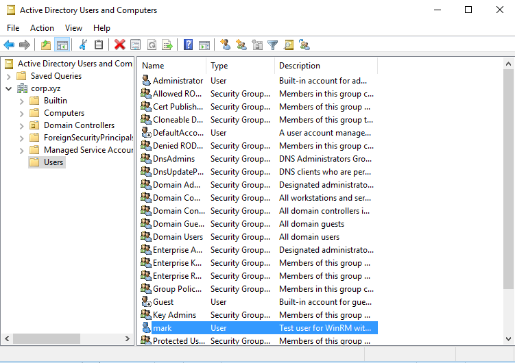 To confirm this theory without leaking OSCP lab data, I built a local lab. So I setup a windows server 2016 Active directory environement, using corp.xyz as the domain name, with the user mark and password “Password123!”