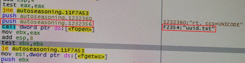 I went back to IDA Pro. I located the subroutine responsible for reading the file. It pointed to a data offset containing the string uuid.txt.