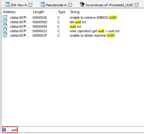 I started by looking at the Strings view. I searched for terms like “UUID”, “Serial”, “BIOS”, and “GetSystemInfo”.
